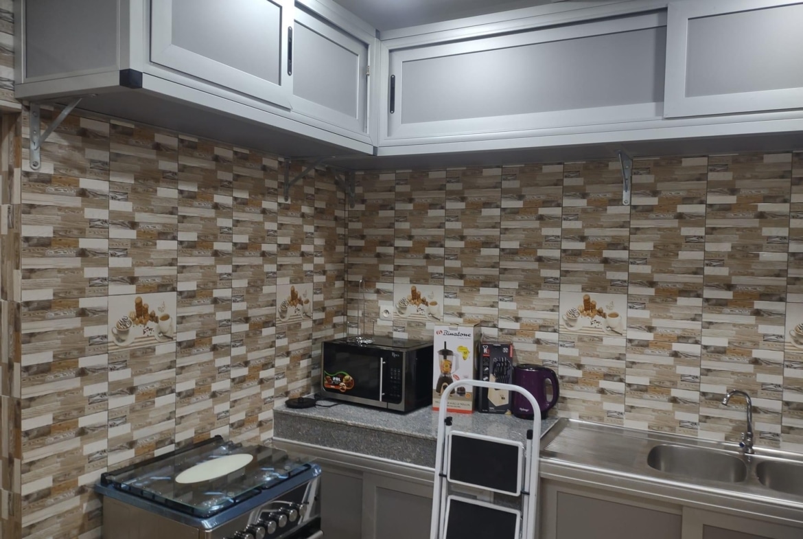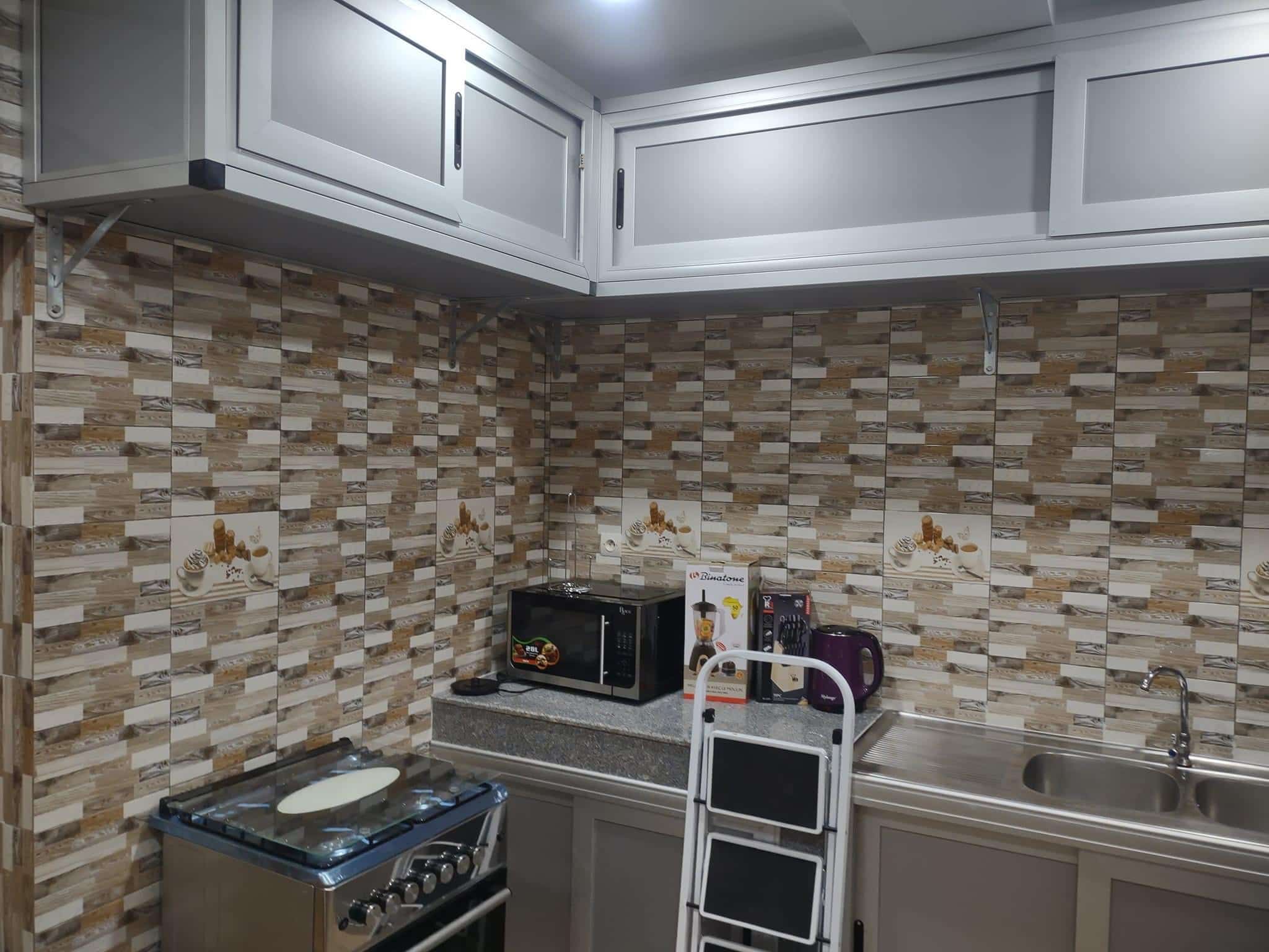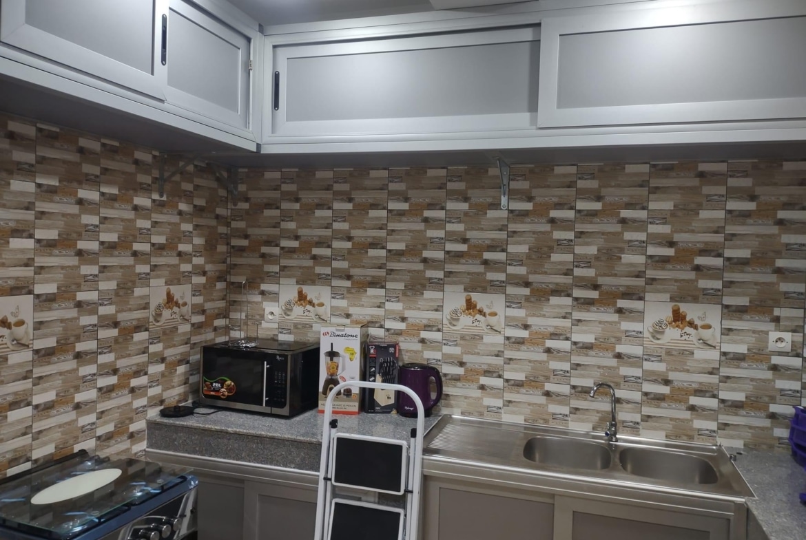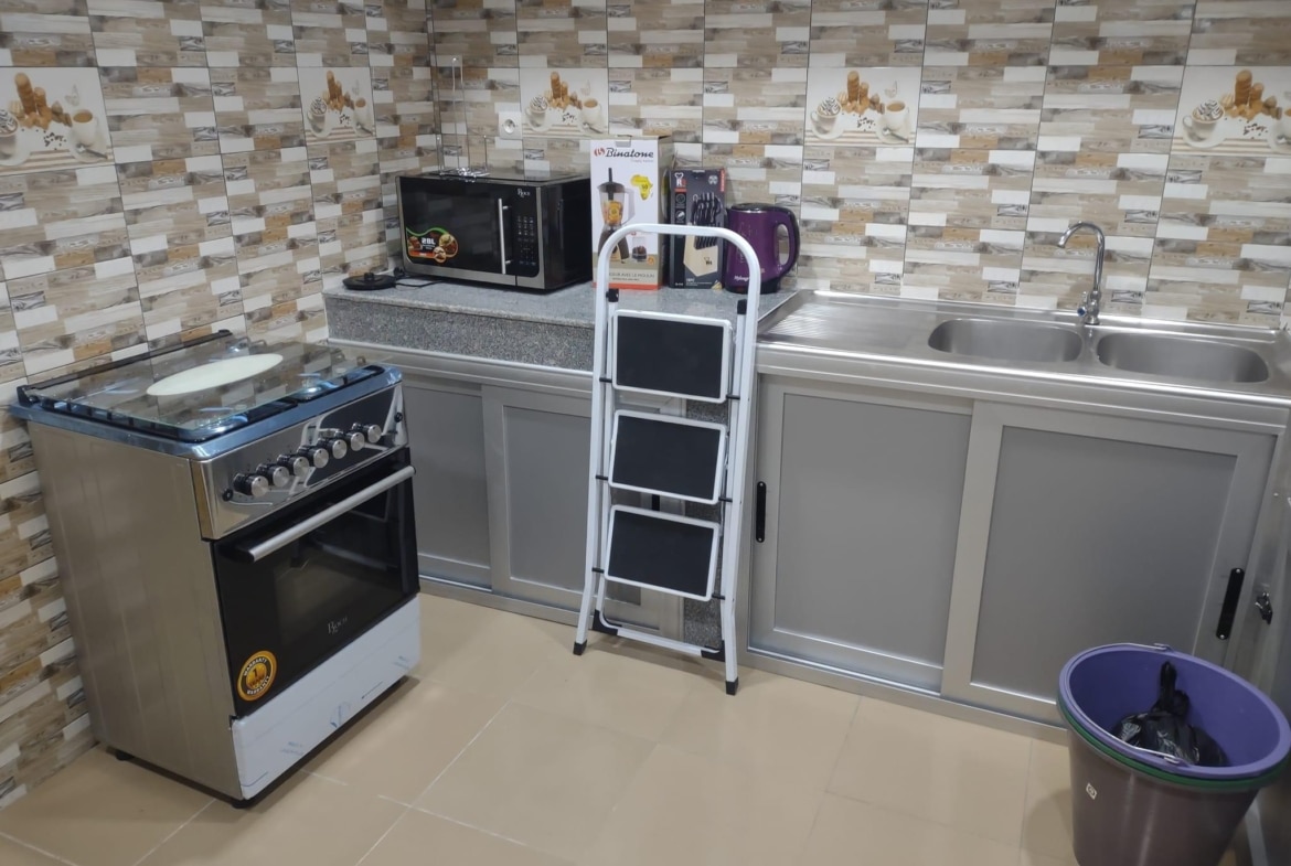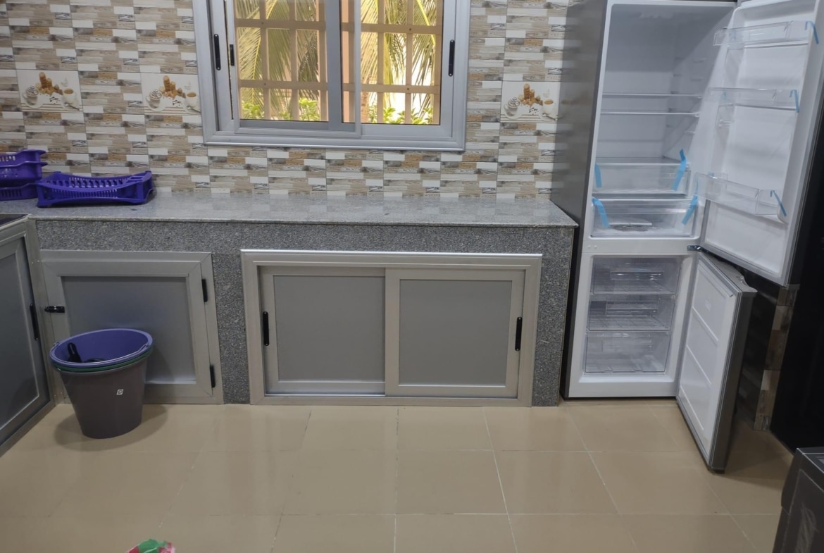 * LA CUISINE EST BIEN LARGE Avec : Un frigo de 400L ; une Machine à laver, micro ondes etc…. Tout est Disponible ( accessoires de cuisine )